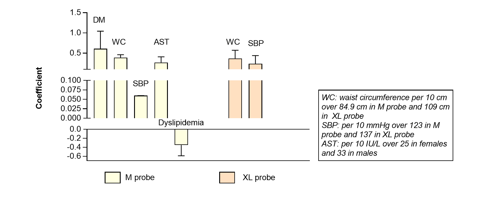 يظهر الشكل رقم ٤ تتائج التحليل التراجعي regression analysis للعوامل التي تؤثر بشكل مهم على قياس قساوة الكبد زيادةً أو نقصاناً وذلك لكلٍ من المرضى غير البدينين (المفحوصين بالمجس M) والمرضى البدينين (المفحوصين بالمجس XL).  يزيد الداء السكري ومحيط الخصر من قيم قساوة الكبد عند الأشخاص غير البدينين والمفحوصين بالمجس M، بينما